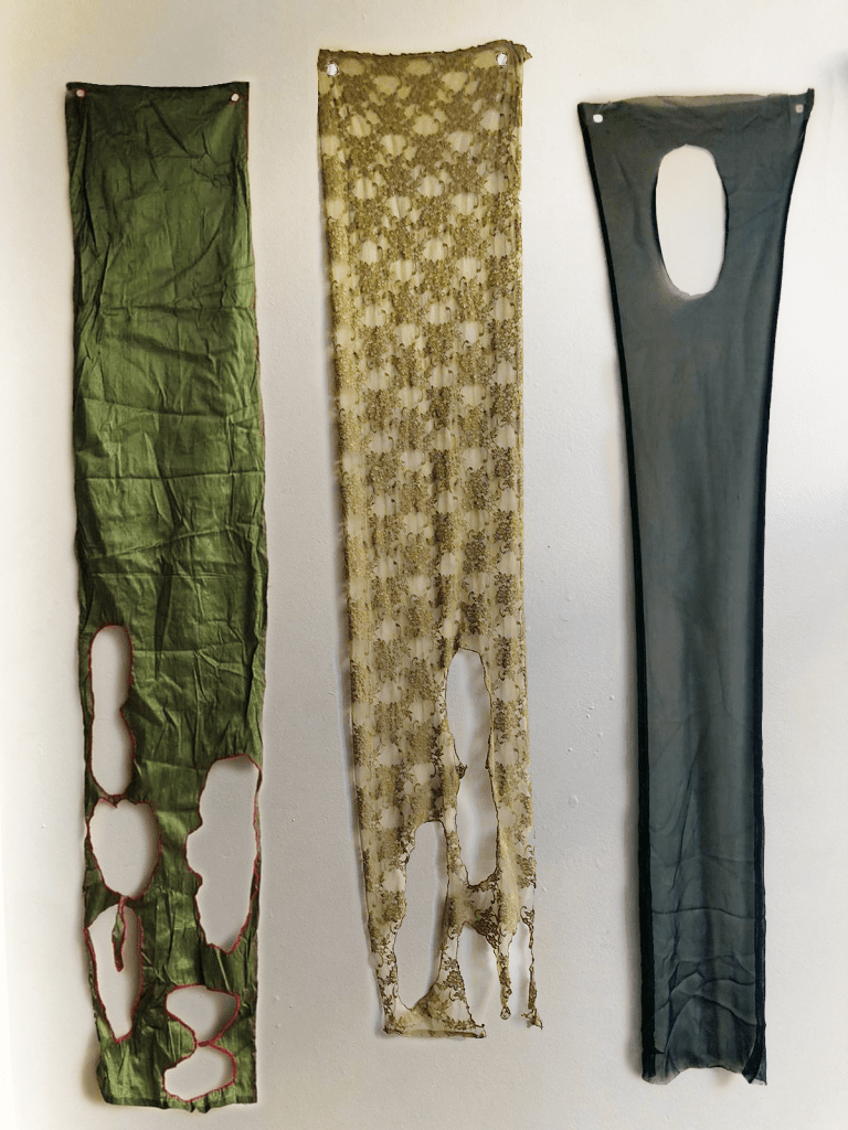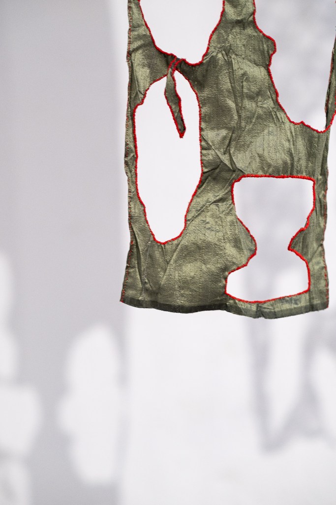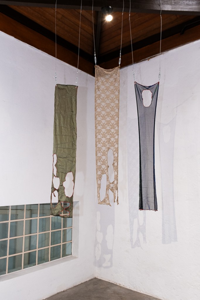 Não existe meio buraco. Um buraco é sempre inteiro, cabe sempre em si. Sempre único. Verdade irônica, postula a própria ausência como inteireza. Os buracos, fendas, lacunas são parte de mim, extensão grande da minha pele, e neles há falta, perda, todas aquelas palavras que se repetem incessantemente na minha boca, na minha vida, na minha produção. Mais do que produto em si, esse trabalho é um procedimento perpétuo. Como um mantra, me proponho a costurar sem prender. Quero suturar, cicatrizar, estancar os buracos, e, ao mesmo tempo em que os evidencio, procuro respeitar os limites já presentes entre a matéria e o vazio.